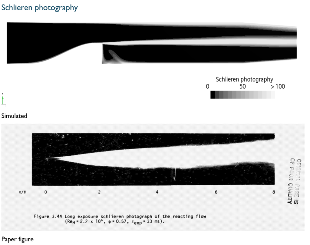 Diagram 2. Backward-Facing Step schlieren photo simulation vs paper. This is the only visual of the flame available in the original paper.