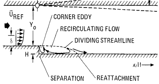 Diagram 1. Backward-facing step cross section and flow direction. Recirculation after step.