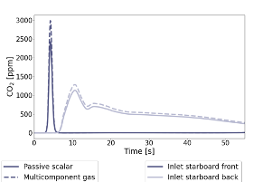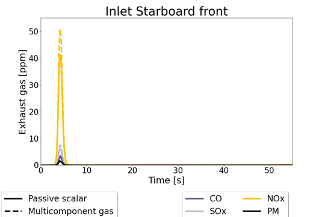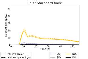 In conclusion, if you are interested in the peak values of exhaust gases over time at certain spots on the ship it would be best to use a multicomponent gas. Furthermore, if you are interested in the specific gas components, the multicomponent gas method is better as well. This is because it takes more work up front, but is less error prone once post processing, since all gas component settings are set. The passive scalar method is much stronger in steady simulations or (long) transient simulations where only the general behaviour of the exhaust gas is of interest.