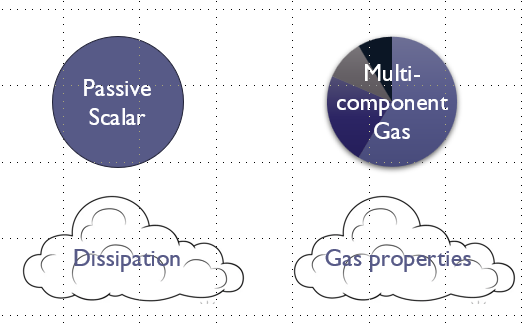 The second method makes use of a multi-component gas. In this case the gas is divided into each of the exhaust components (e.g. air, CO, CO2, NOx, SOx, soot particles). Each gas component is given the corresponding material properties as well as the correct mass fraction (or mole fraction) within the multi-component gas. This method thus has much more pre-processing work, since each component needs to have the correct values added. The dispersion of the exhaust gas will then be dependent on the gas properties of each of the components within the exhaust gas, making the method more realistic.